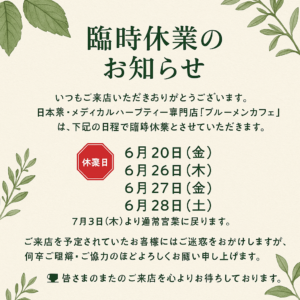 いつもご来店いただきありがとうございます。日本茶・メディカルハーブティー専門店「ブルーメンカフェ」は、下記の日程で臨時休業とさせていただきます。