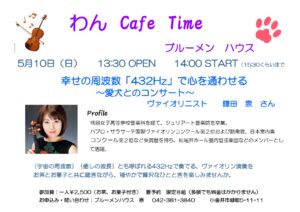 「宇宙の周波数」「癒しの波長」とも呼ばれる、432Hzにチューニングして、人はもちろん、植物、農産物、牛、鳥などの前でも演奏し、その反応の凄さに感動し、活動しているヴァイオリニスト、鎌田 泉さんをゲストに招き、わんこと一緒に演奏を聴きます。