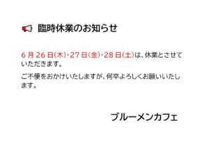 本日6月26日(木)~6月28(土)までの3日間は臨時休業とさせて頂きます。
